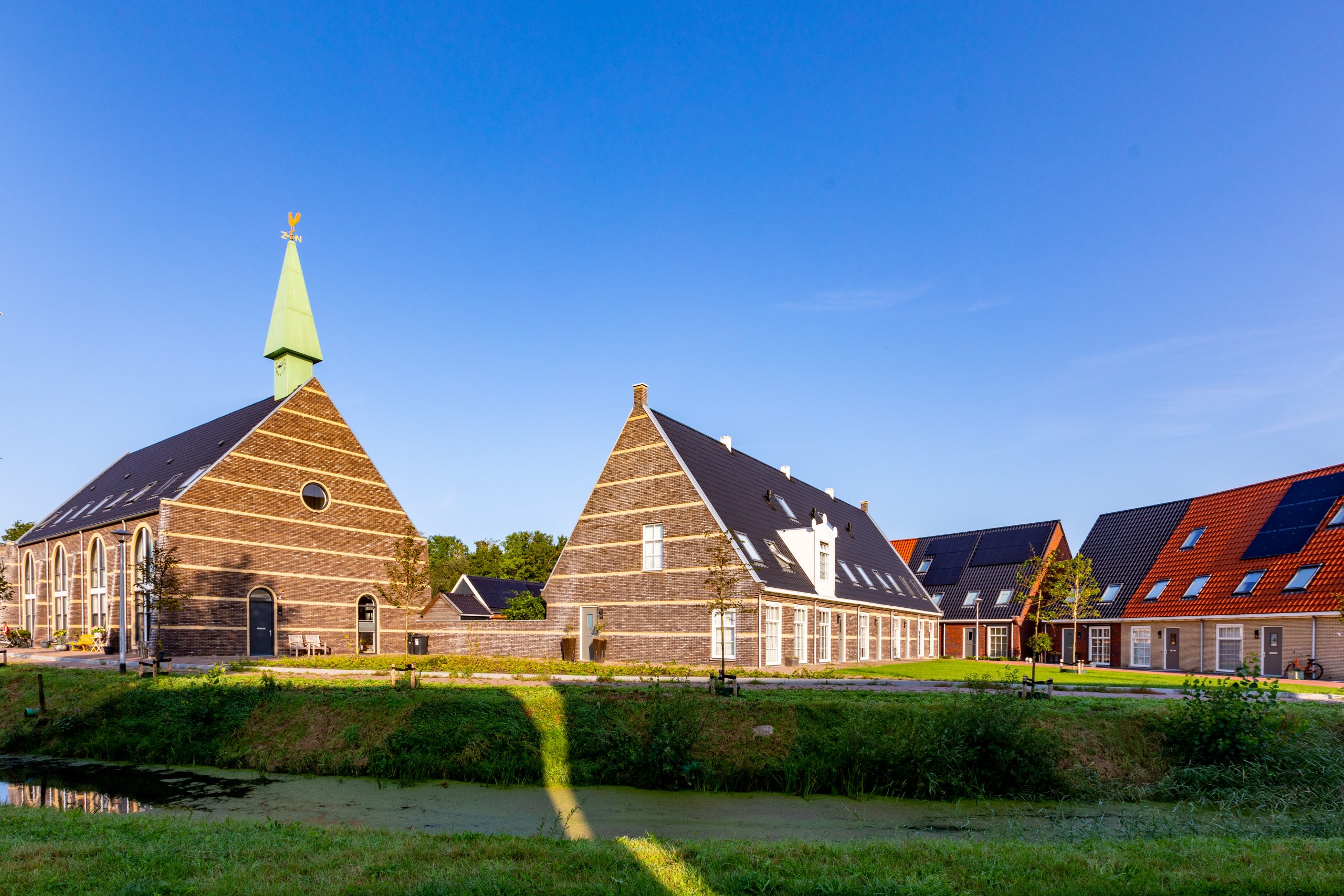 Houtskeletbouw bewijst wel dat vele variaties en woningvormen mogelijk zijn. Zo bouwden wij in Jabikswoude dit unieke project: een imposante kerk waarin 4 woningen zijn gebouwd en daar omheen 12 terp- en 5 kloosterwoningen. Met name de kerk is een gebouw dat opvalt en dat iedereen zal herkennen door onder andere de imposante kerkramen aan de voor- en achterzijde. De woningen vallen niet alleen op door de unieke architectuur, maar ook door het feit dat ze boven alle andere woningen in Jabikswoude uitsteken. De Kapel is namelijk gebouwd op een terp.