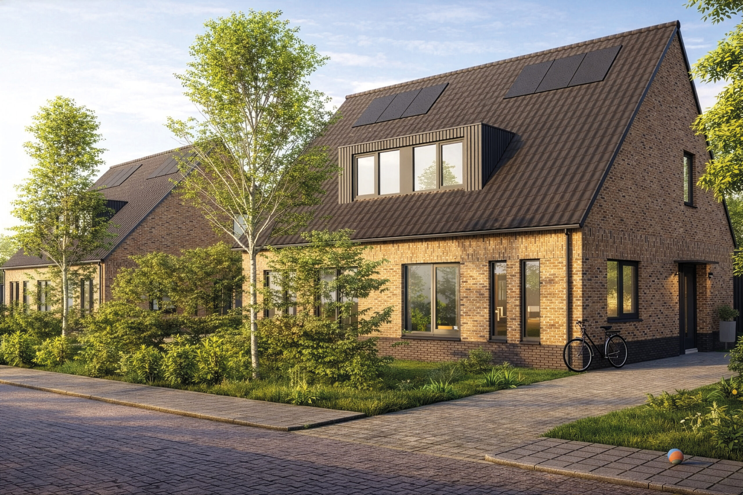 stijl combineert. De woningen zijn vormgegeven met geel gemêleerd metselwerk, aangevuld met antracieten accenten die zorgen voor een eigentijdse uitstraling. Elke woning beschikt over een fraaie dakkapel met houten gevelbekleding, wat niet alleen extra ruimte en licht op de verdieping creëert, maar ook een